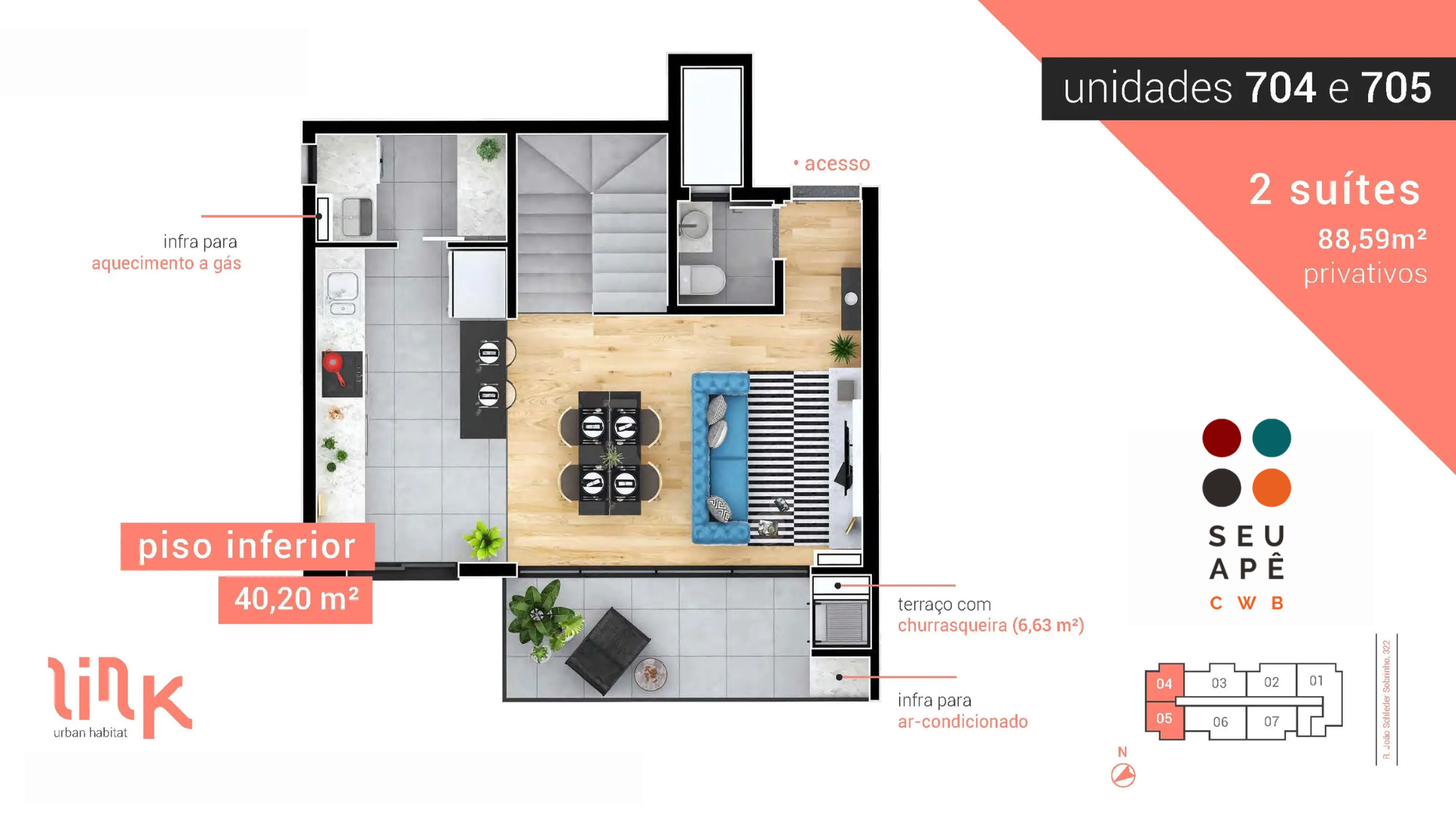 - Planta com 83.54m² + Terraço 6.29m²