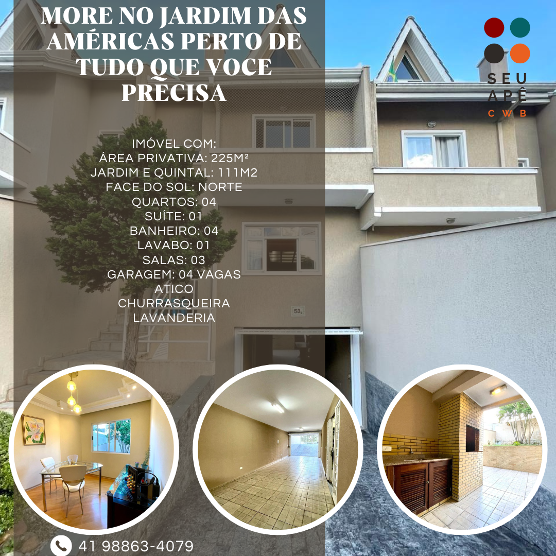 Em uma rua residencial tranquila do Bairro Jardim das Américas, de frente a praças lindas como a Praça Tsunessaburo Makiguti em Curitiba-PR, este sobrado lindo espaçoso com 225m² + 111m2 de jardim e amplo quintal nos fundos.